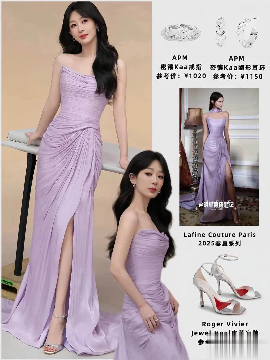 这条高开叉的紫色礼服显得她的身材比例很好,整个人高挑纤细。她脚上穿了一双银色的Roger Vivier的系带高跟鞋,她涂了豆沙色的脚指甲油,从头到脚都很精致。杨紫戴的戒指和耳环都来自她代言的APM。杨紫把这套千元的APM首饰戴出了高珠的感觉,一点也不廉价。